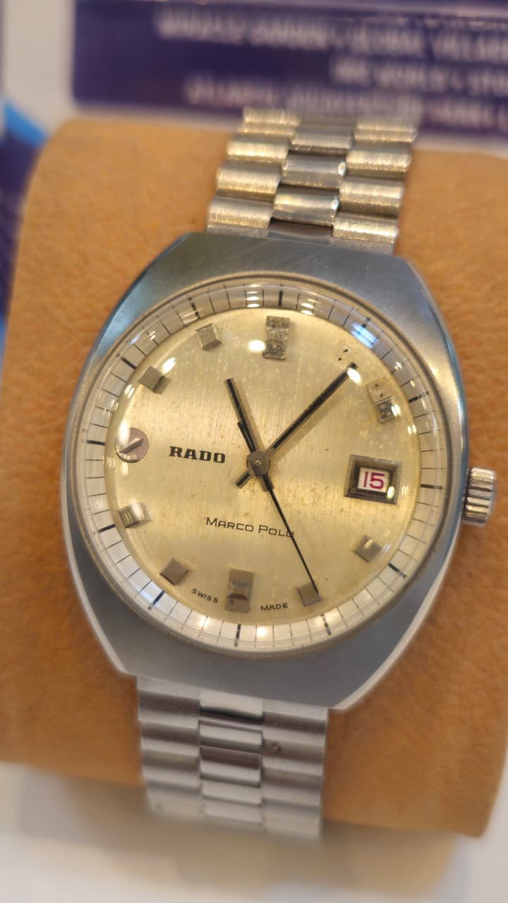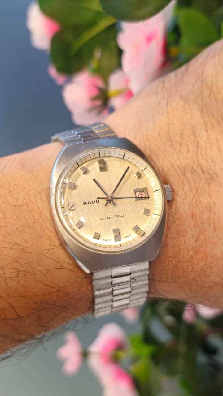 vintage Rado Marco Polo, a classic Swiss-made automatic timepiece that originally debuted in the late 1960s. It is part of Rado’s historic lineage, known for its distinctive “cushion” case design and high-quality mechanical movements.