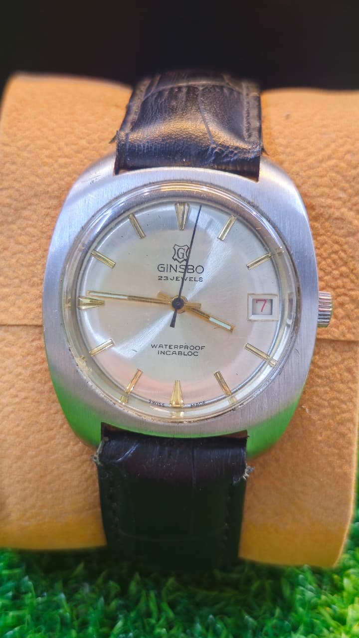 Vintage Ginsbo 23 Jewels wristwatch, likely dating from the 1960s to 1970s. Ginsbo was a Swiss watchmaker known for producing quality timepieces during this era.
