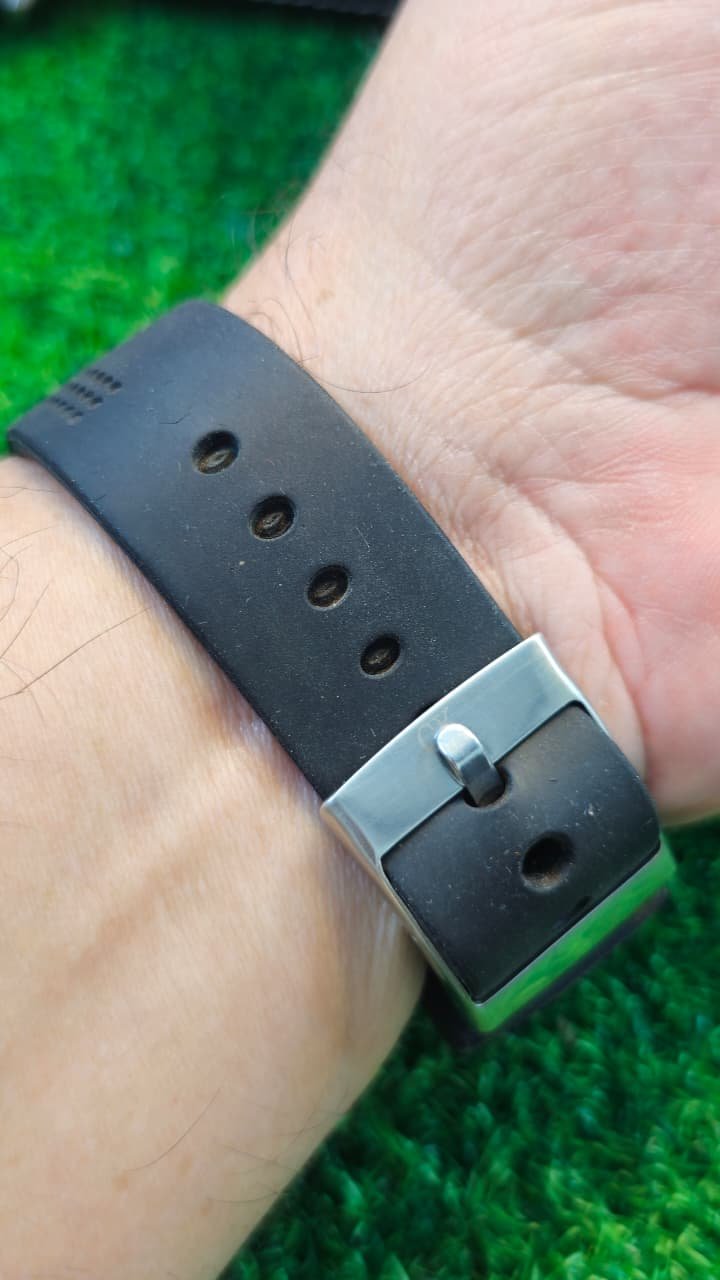 Strap: Black Rubber strap with a pin buckle clasp.