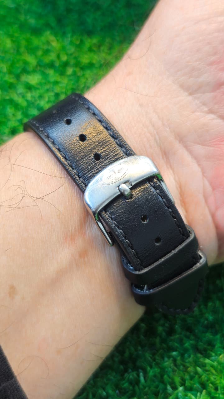 Strap: Black leather strap as shown in the image.