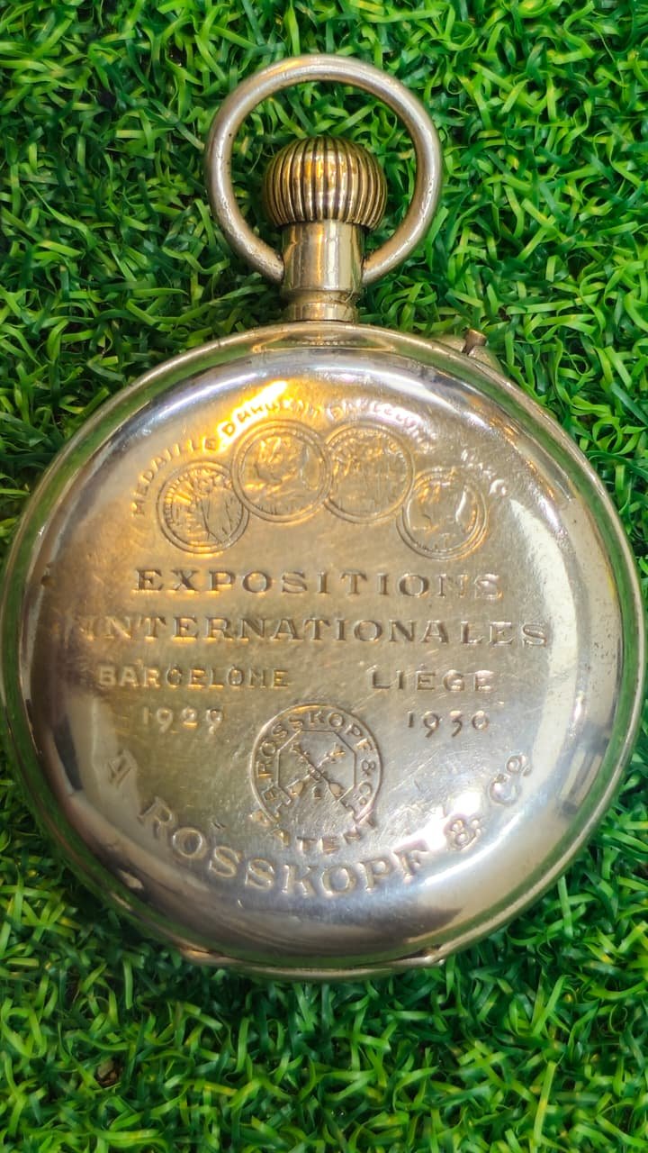 Vintage A. Rosskopf & Co. pocket watch. Based on the inscriptions, this specific model commemorates the international expositions (trade fairs) held in Barcelona (1929) and Liège (1930), where the company likely won medals for its craftsmanship.