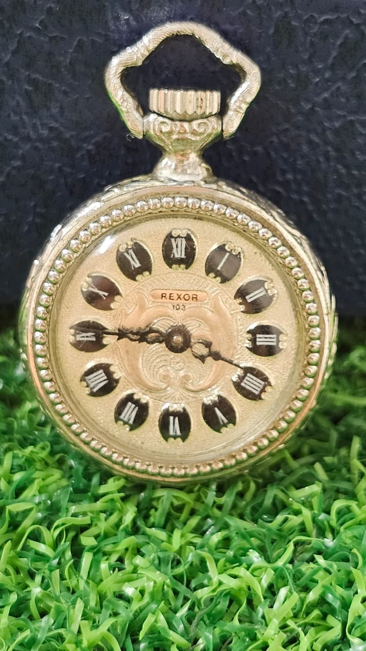 vintage Rexor 103 mechanical pocket watch, often referred to as a pendant watch due to its small size and decorative design.