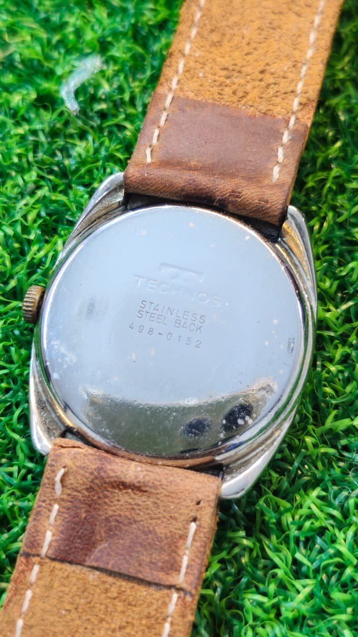 Movement: Likely a manual-wind mechanical movement, indicated by the presence of a sub-seconds dial (small second hand). Many vintage Technos models were Swiss-made.