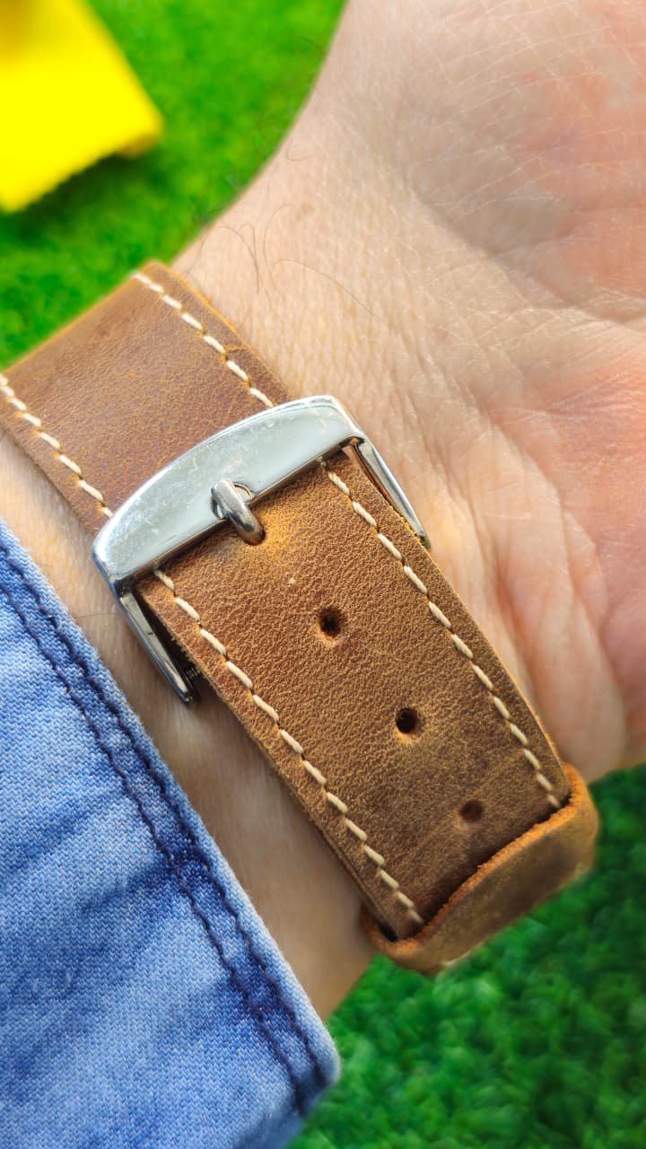 Strap: Fitted with a brown leather strap featuring white contrast stitching, which appears to be an aftermarket addition based on similar vintage examples online.
