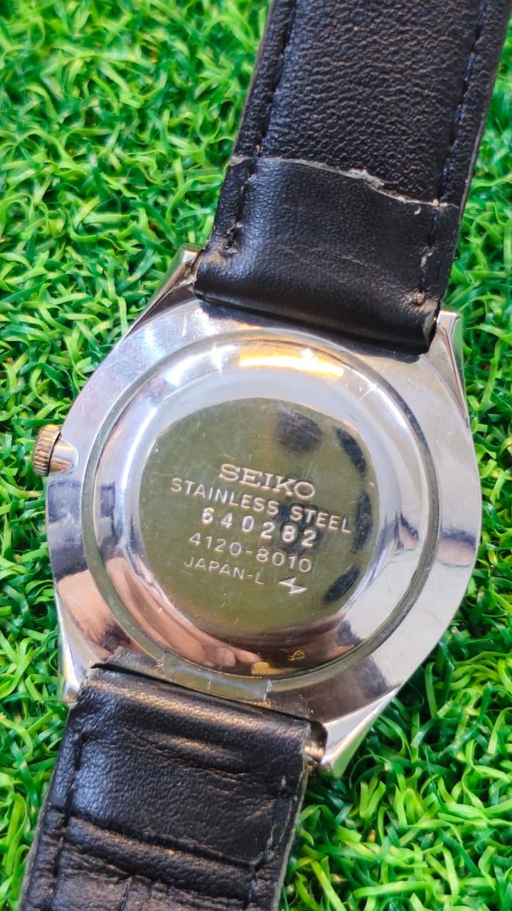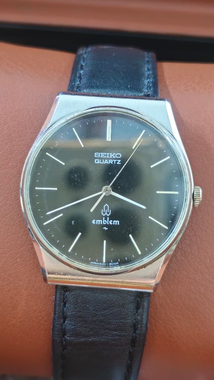 vintage Seiko Emblem, specifically the model reference 4120-8010. This Japan Domestic Market (JDM) timepiece dates back to the mid-1970s, with production examples often cited from 1975.