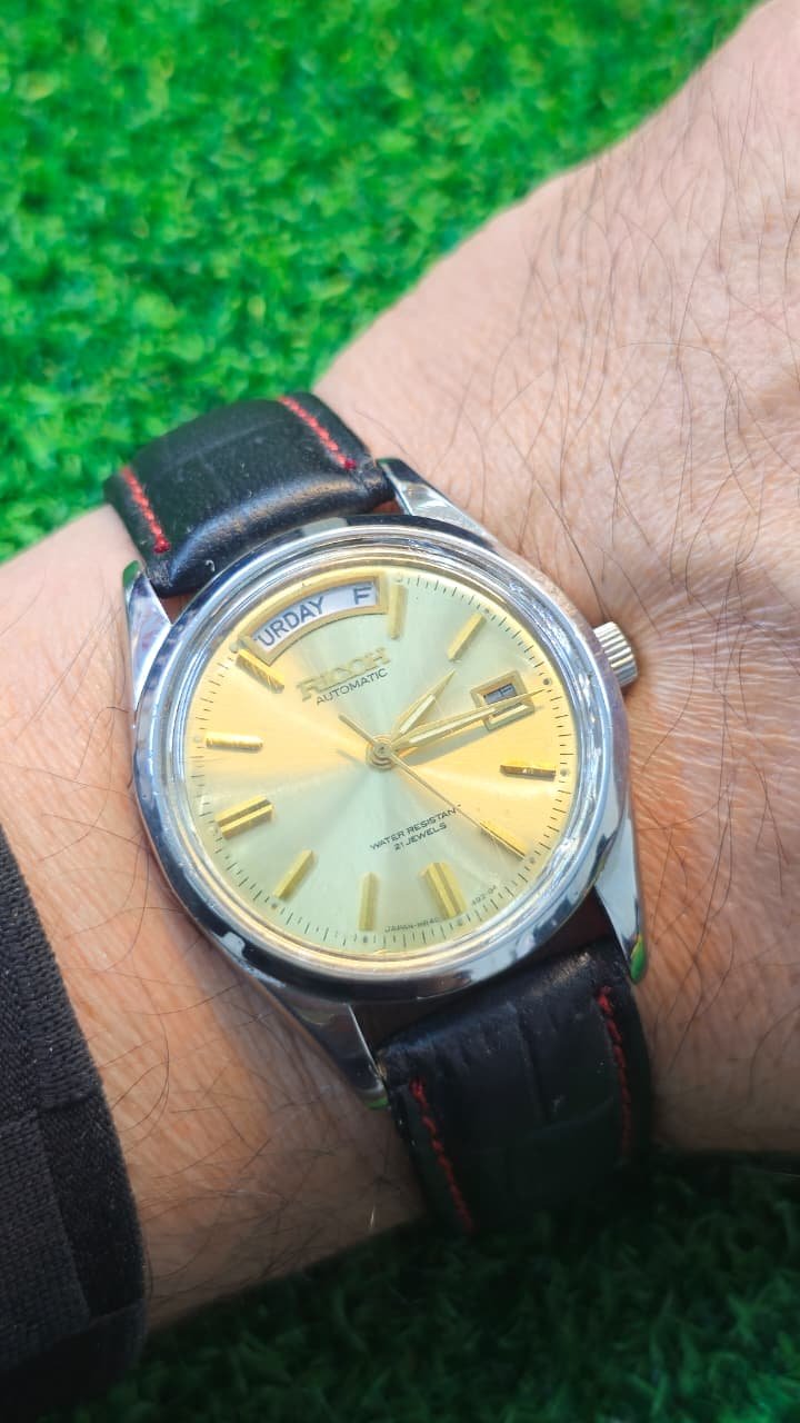 Vintage Ricoh President Automatic, a classic timepiece from the Japanese brand Ricoh. This specific model is part of their series that gained popularity for its design similarities to the Rolex Day-Date, often nicknamed the “President” style.