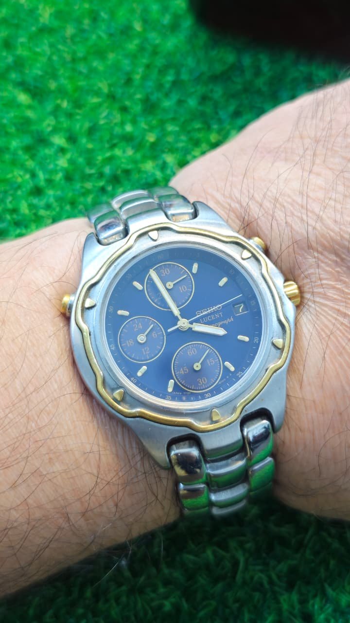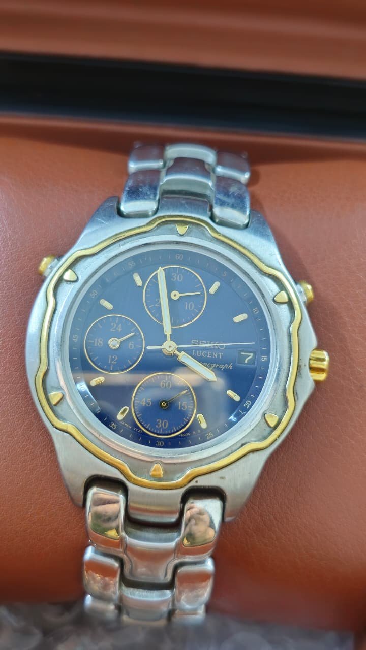 This watch is a Seiko Lucent 7T27-6000, a vintage quartz chronograph. It features a blue dial with gold-tone accents and a distinctive scalloped bezel.