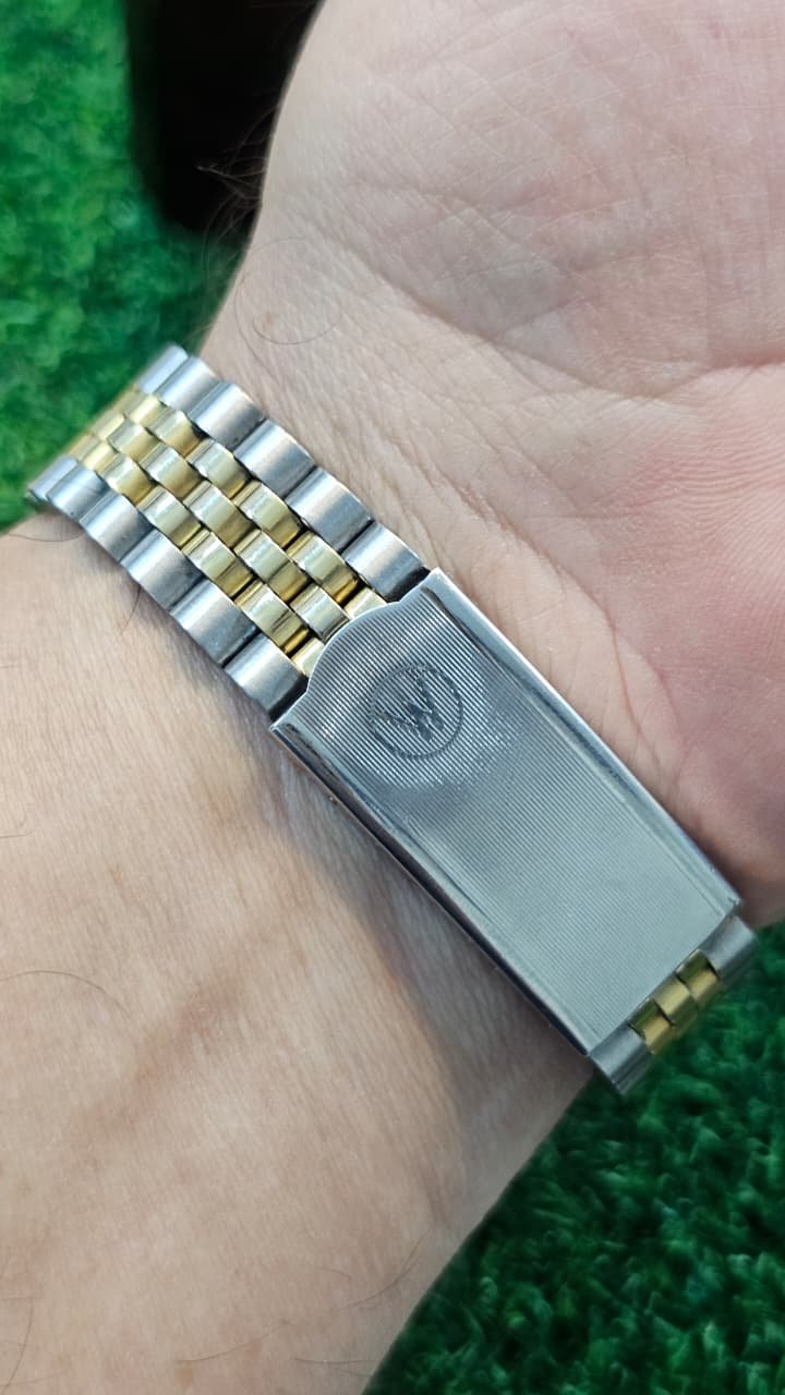 Materials: The watch features a two-tone stainless steel case and a matching jubilee-style bracelet. The hour markers are applied “diamond” or stone indices.