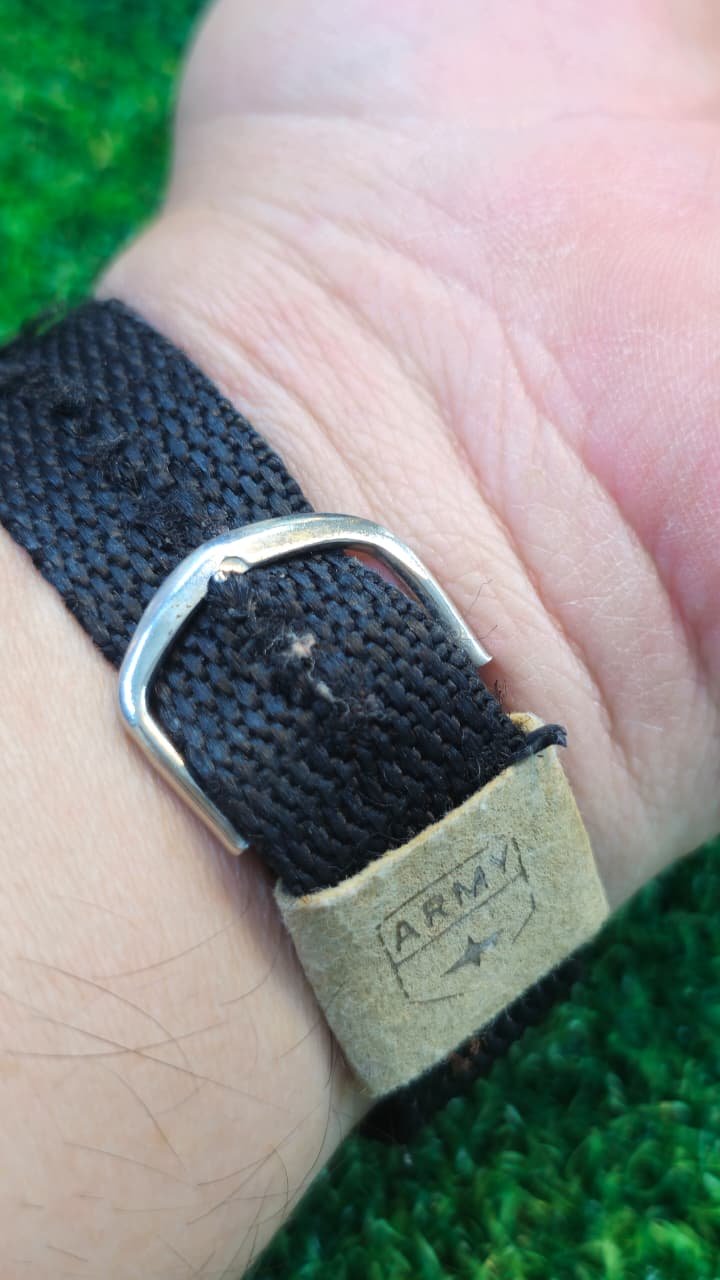 Strap: The watch is fitted with a Original black perlon or woven nylon strap, which is a popular choice for vintage military watches.